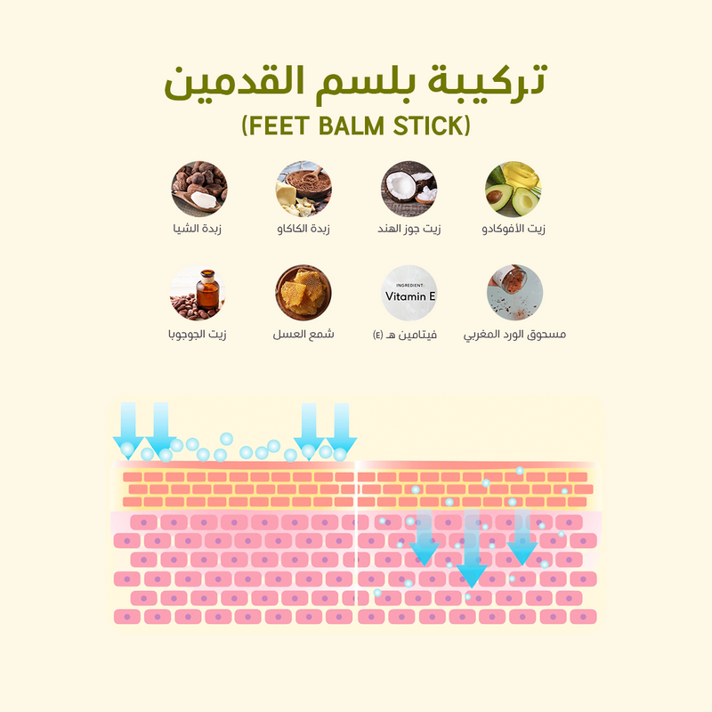 حماية وتجديد: يعمل فيتامين هـ وشمع العسل على حماية خلايا الجلد وتجديدها، بينما يضيف العكر الفاسي خصائصه المغذية التي تعيد للقدمين نضارتهما.