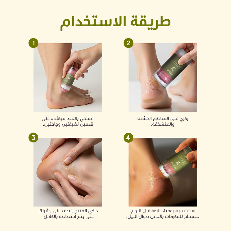 ترطيب عميق وإصلاح: تعمل زبدة الشيا وزبدة الكاكاو مع زيت جوز الهند وزيت الأفوكادو على اختراق الجلد السميك، وتغذية القدمين من الداخل، مما يساعد على علاج التشققات.