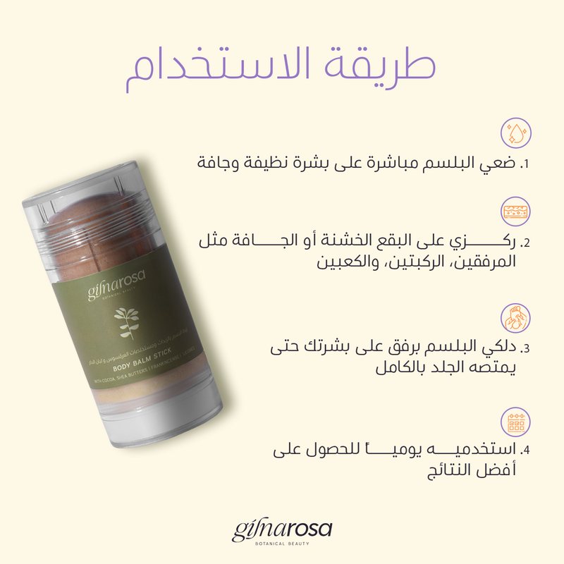 - اعتني بالمناطق الجافة: يُوضع البلسم يومياً على المناطق الخشنة أو الجافة مثل الكوعين والركبتين والكعبين.
