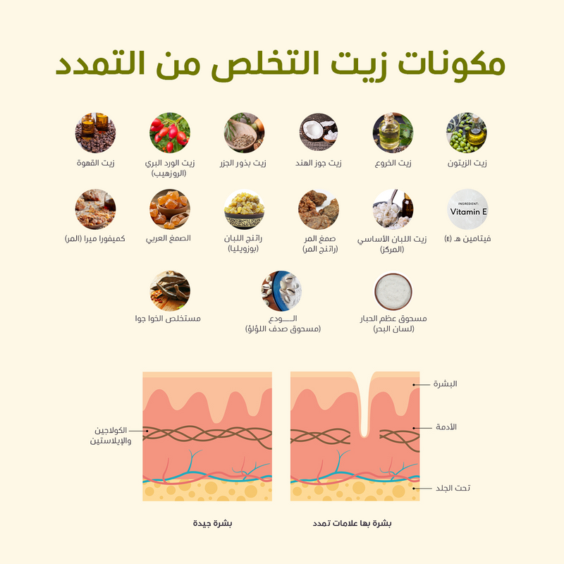 - المواد المفتحة (الودع والصمغ العربي): لتنعيم ملمس الجلد وتفتيح التصبغات المرافقة لعلامات التمدد حيث يعتبر الودع كولاجين بحري طبيعي.