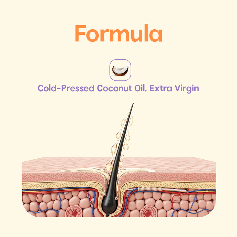 1. Penetration & Nourishment Phase The journey begins by providing deep hydration and preparing the hair. This is where cold-pressed coconut oil plays its role, as it easily penetrates the hair to give it long-lasting hydration, and its properties work to nourish and strengthen the hair follicles.