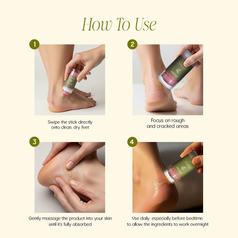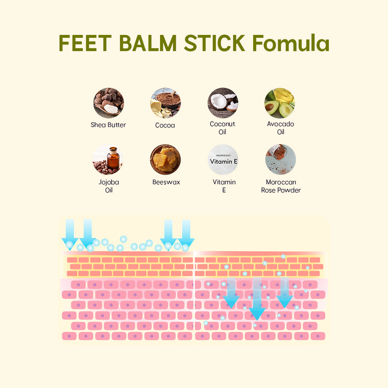 This stick combines the power of natural butters and oils that work in perfect harmony: Deep Hydration & Repair: Shea and cocoa butters, along with coconut and avocado oils, work to penetrate thick skin and nourish the feet from the inside, which helps to heal cracks. Protection & Rejuvenation: Vitamin E and beeswax work to protect skin cells and renew them, while Aker Fassi adds its nourishing properties that restore your feet's freshness.