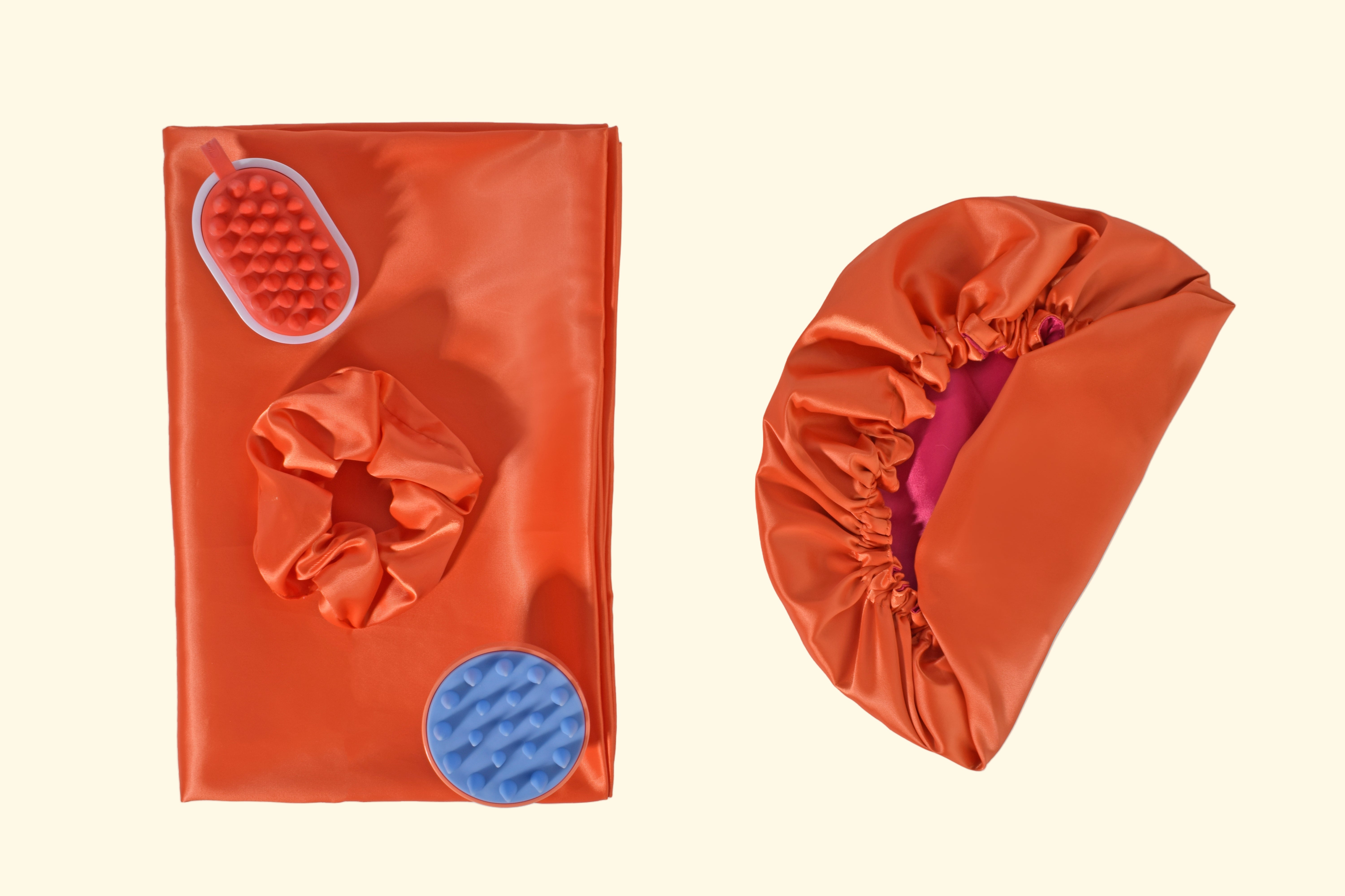 Transform your hair care routine with this thoughtfully designed bundle. The satin pillowcase minimizes frizz, reduces breakage, and protects your hair's natural moisture while you sleep. The satin scrunchie offers a gentle, no-damage hold, perfect for securing your hair with care. The satin bonnet locks in hydration and prevents friction, keeping your hairstyle intact and your hair silky smooth.