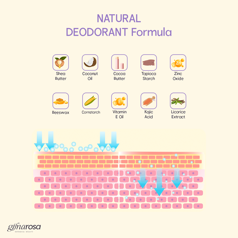 This product combines the power of nature with a deep understanding of skin's needs: Odor-Fighting Ingredients: Ingredients like coconut oil and zinc oxide work with their antibacterial properties to neutralize odor-causing bacteria, giving you a feeling of freshness that lasts all day. Absorption and Protection: Tapioca and corn starch effectively absorb excess moisture, while natural butters and waxes provide a protective layer for the skin against annoying friction. Brightening and Soothing: Brightening ingredients like kojic acid and licorice extract work to lighten pigmentation and unify skin tone, and are enhanced by vitamin E oil which soothes and helps renew the skin.