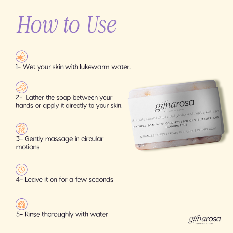 This soap combines the purest cold-pressed coconut oil, with its cleansing and moisturizing properties, and the power of frankincense extract, which work together effectively to restore your skin's youth: