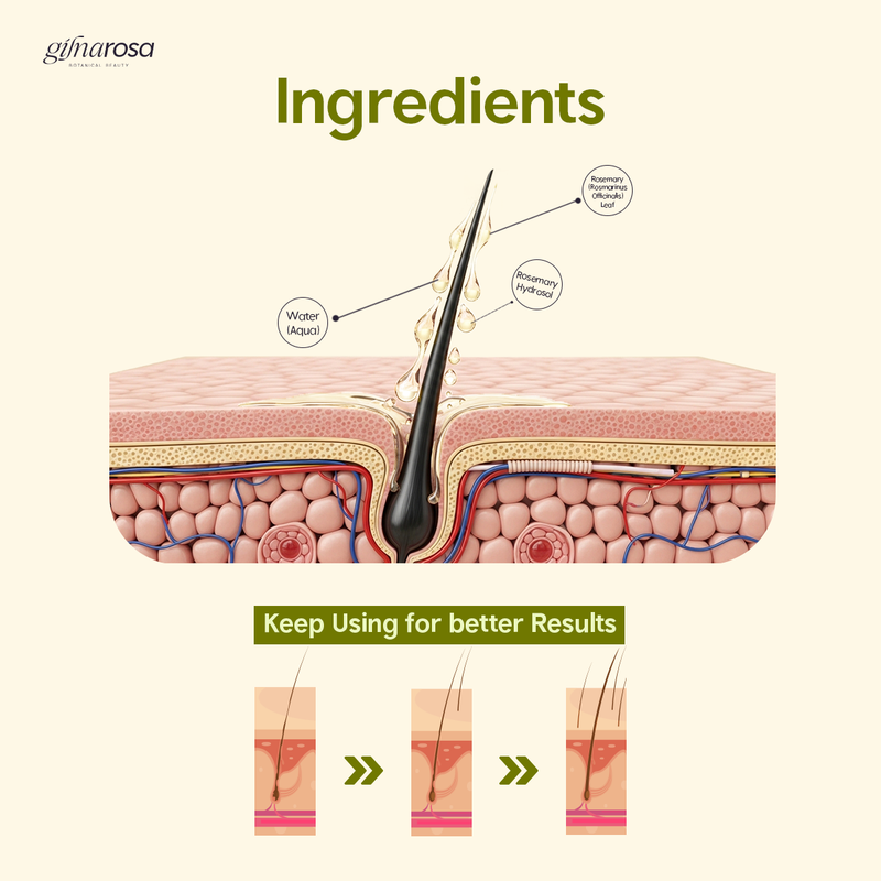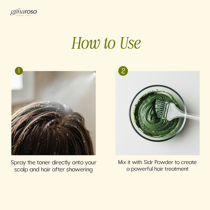 Gilnarosa's Rosemary Hair Toner is more than just a regular extract; it's a complete therapeutic system to revitalize hair from the roots. Its unique formula combines the purest essence of rosemary leaves, obtained through a natural distillation process that ensures the highest concentration and effectiveness, with the power of Sidr powder. These ingredients work together synergistically: rosemary stimulates blood circulation in the scalp for hair growth, while Sidr works to strengthen the follicles and purify the scalp.